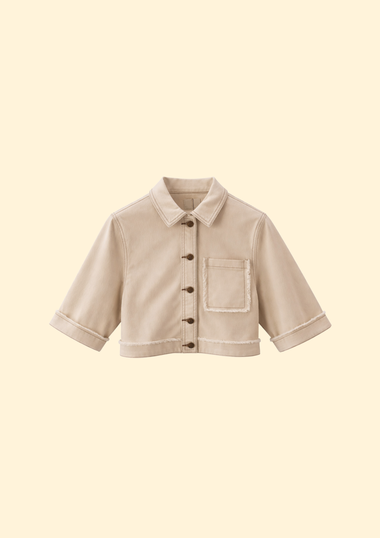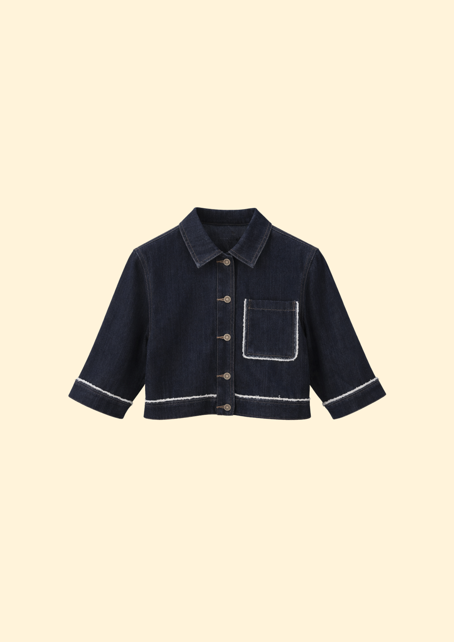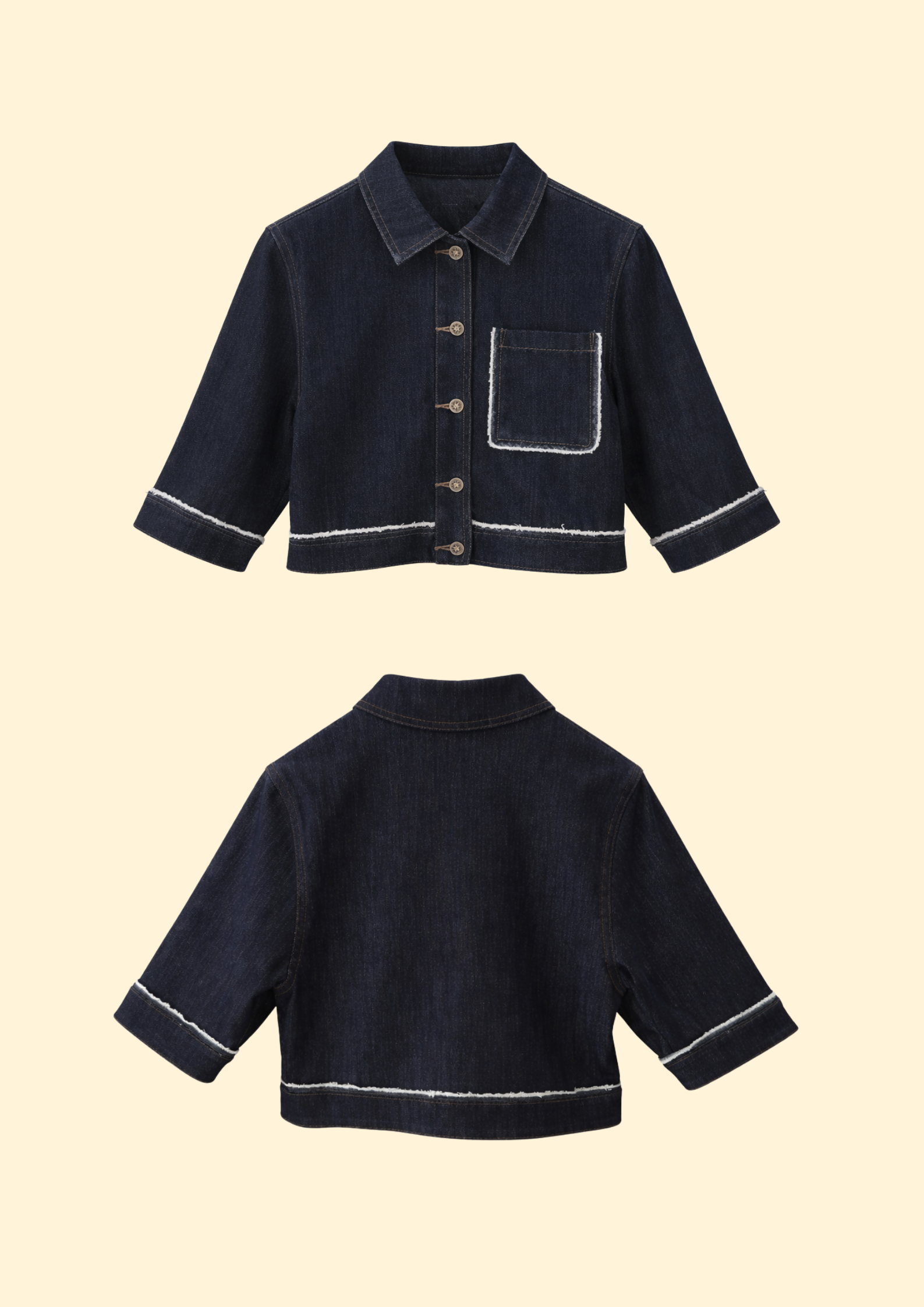 Unit price perThe Freslin Denim Top is a sophisticated cropped button-down blouse that balances a structured boxy fit with refined artisanal details. This collared piece features quarter-length sleeves and is defined by striking contrast frayed trim along the chest pocket, cuffs, and hemline. Its clean, dark denim construction and high-low silhouette make it a versatile staple for creative professional settings, weekend city outings, casual Fridays at the office or as a structured layer over a simple summer dress.
