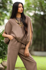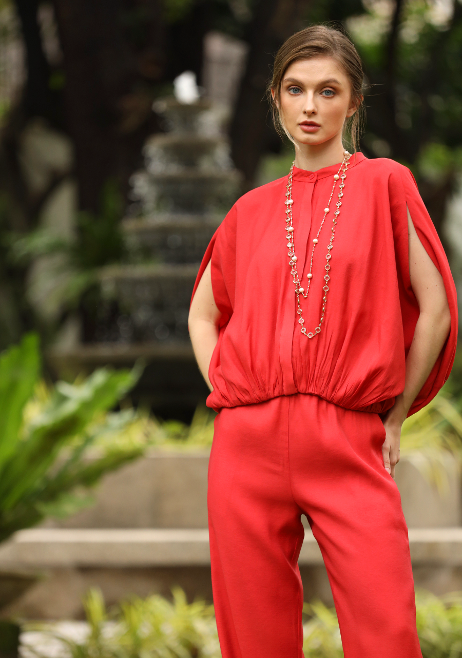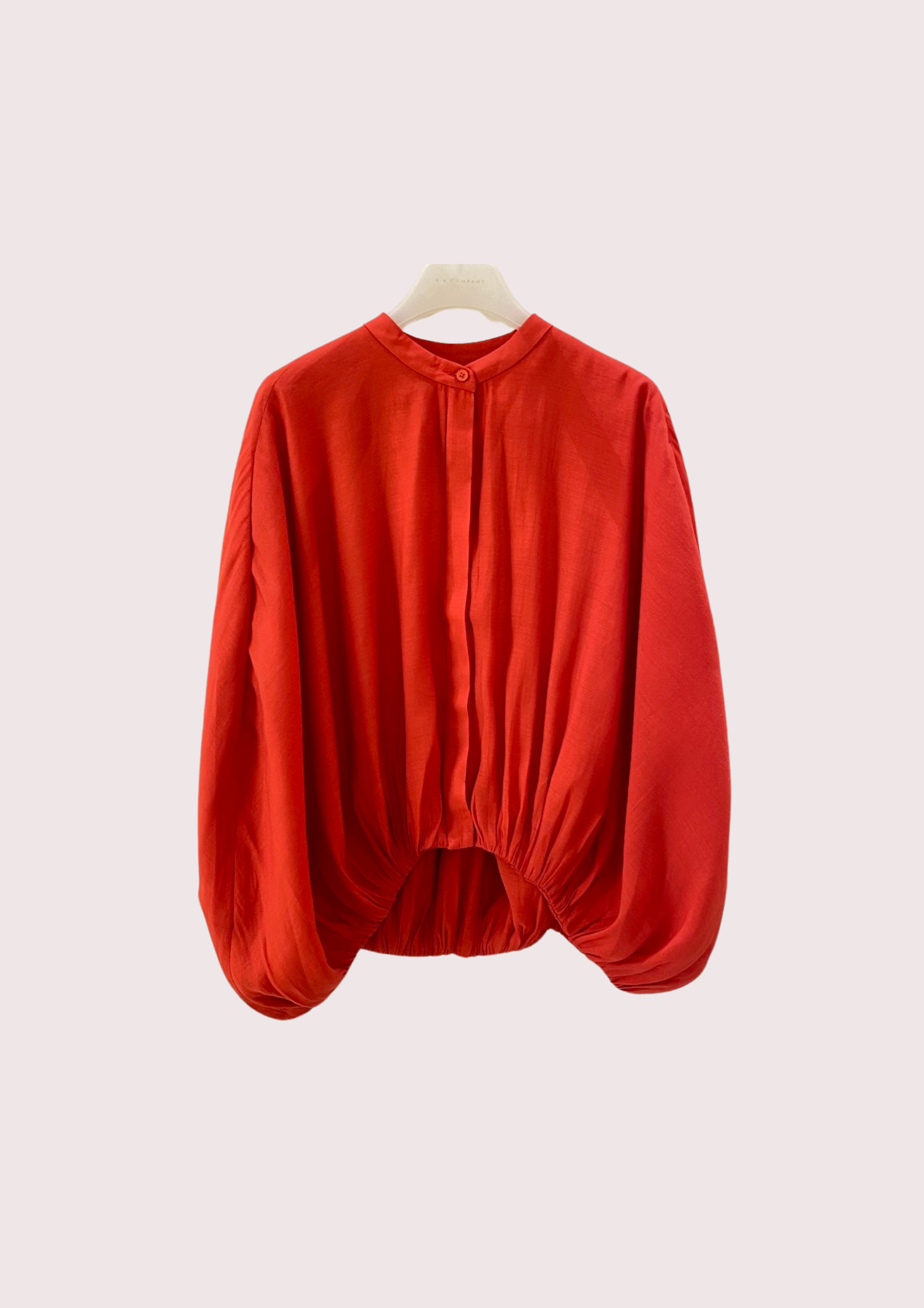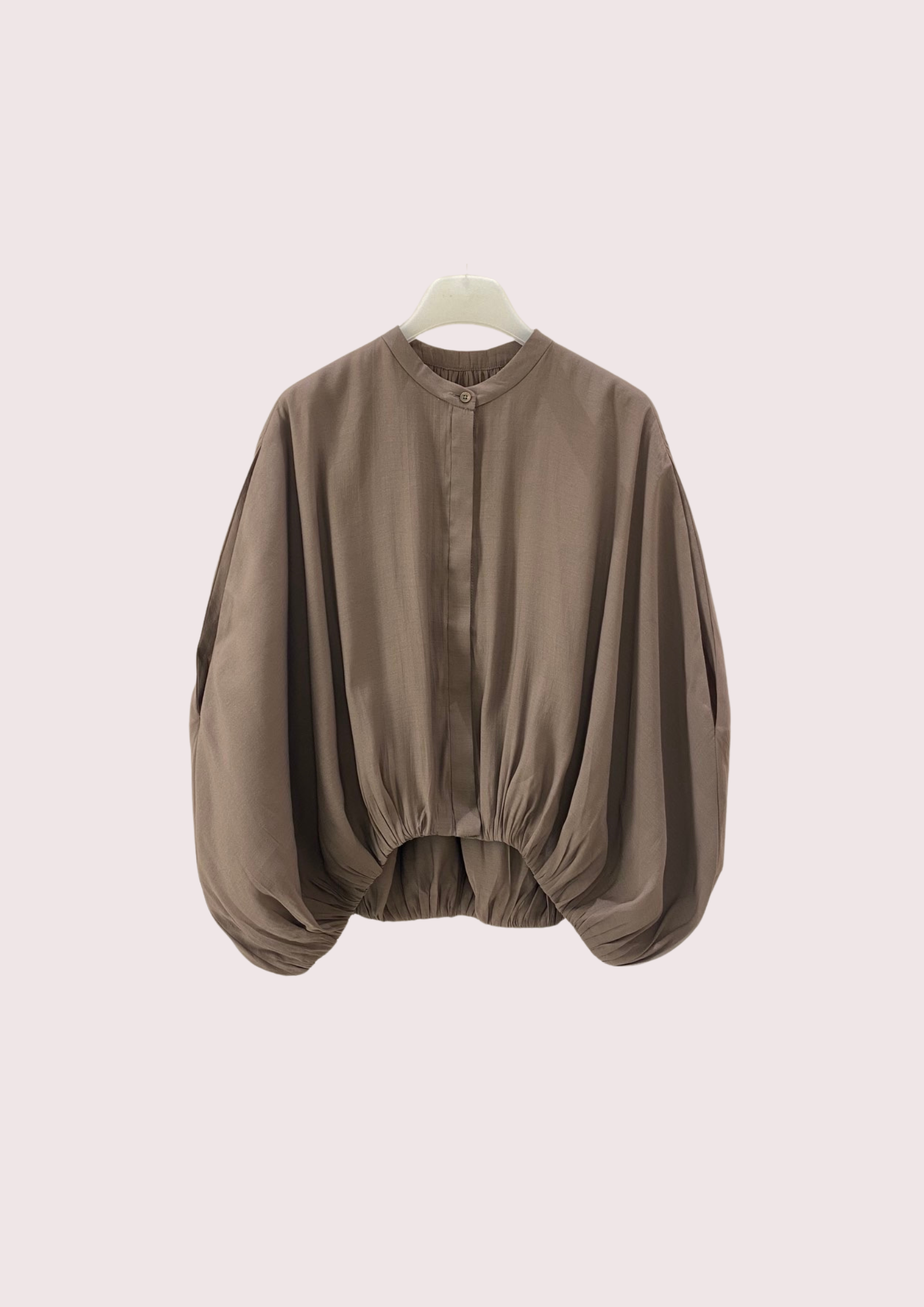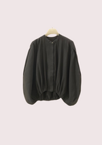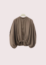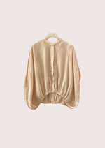 features draped sleeves, a round neck with a button-down closure an hidden placket, and an elastic waist that enhances shape and comfort