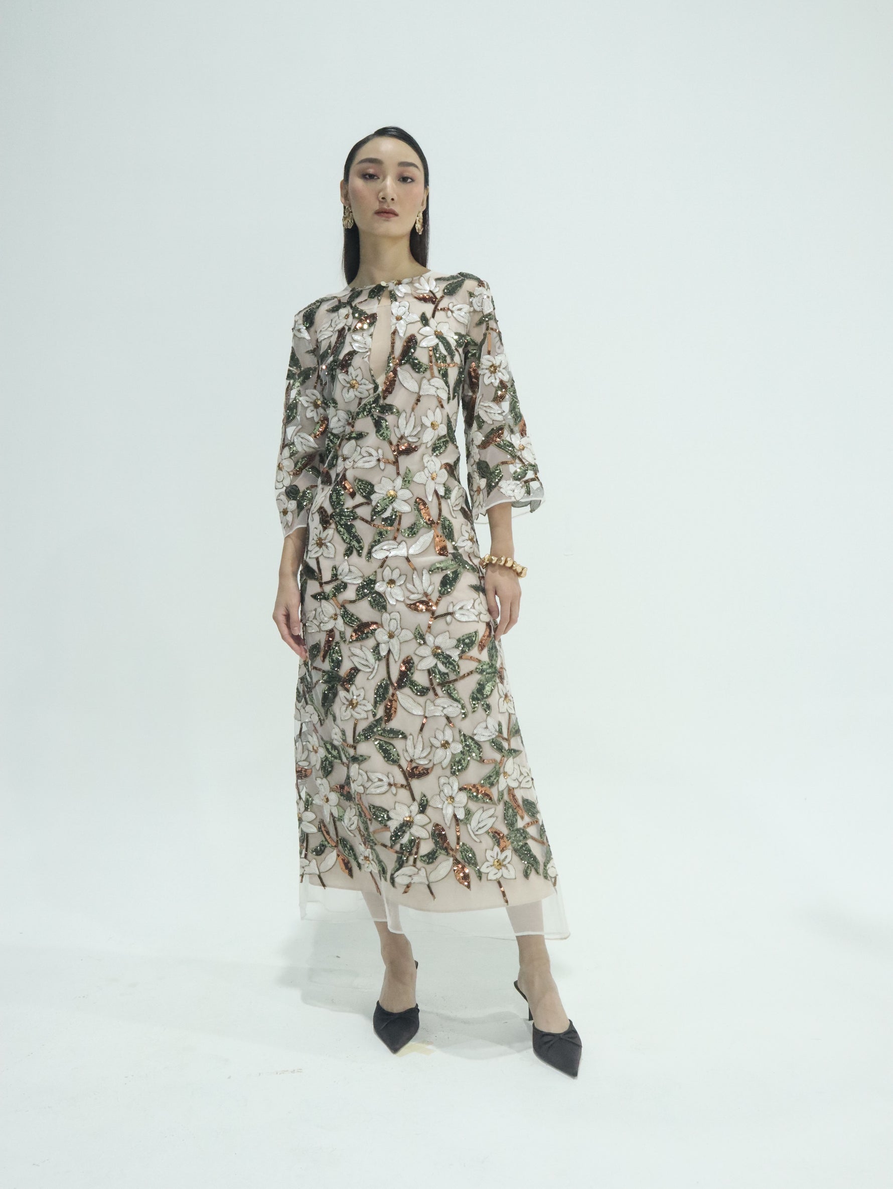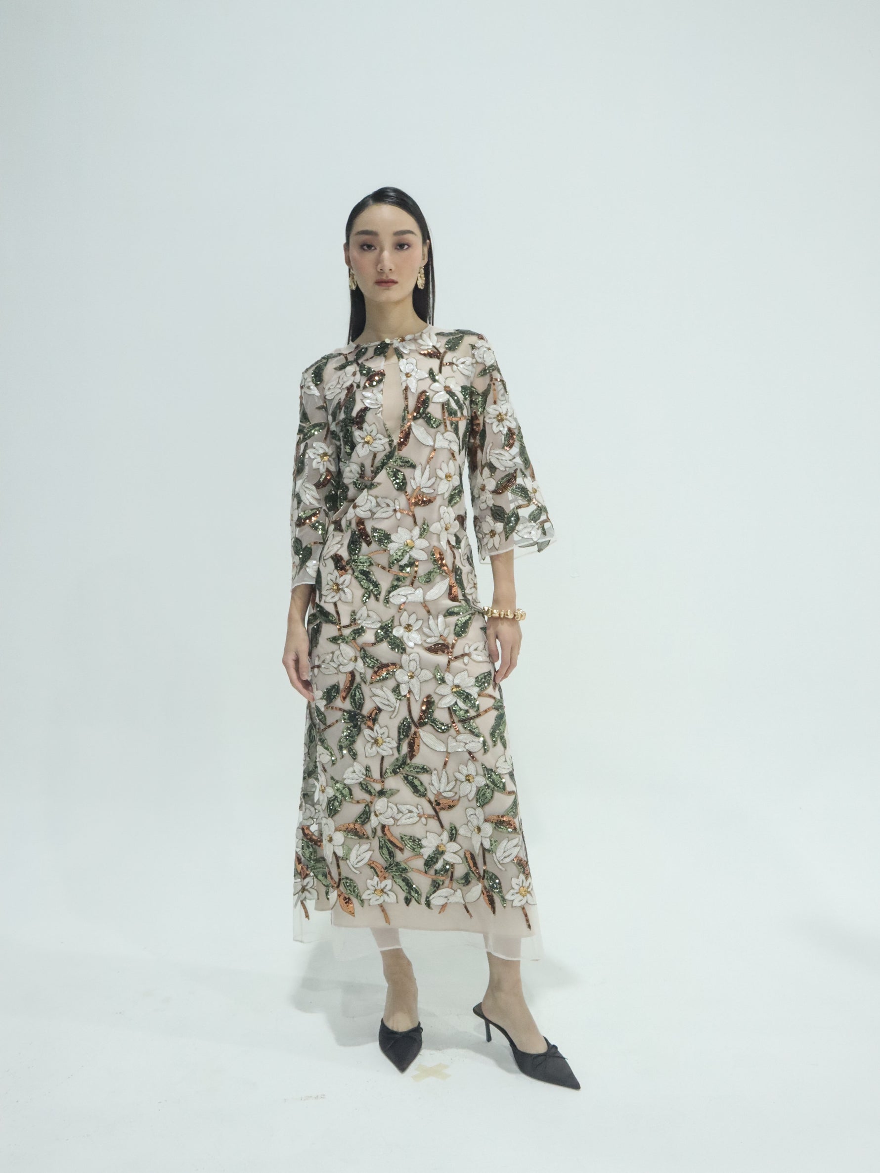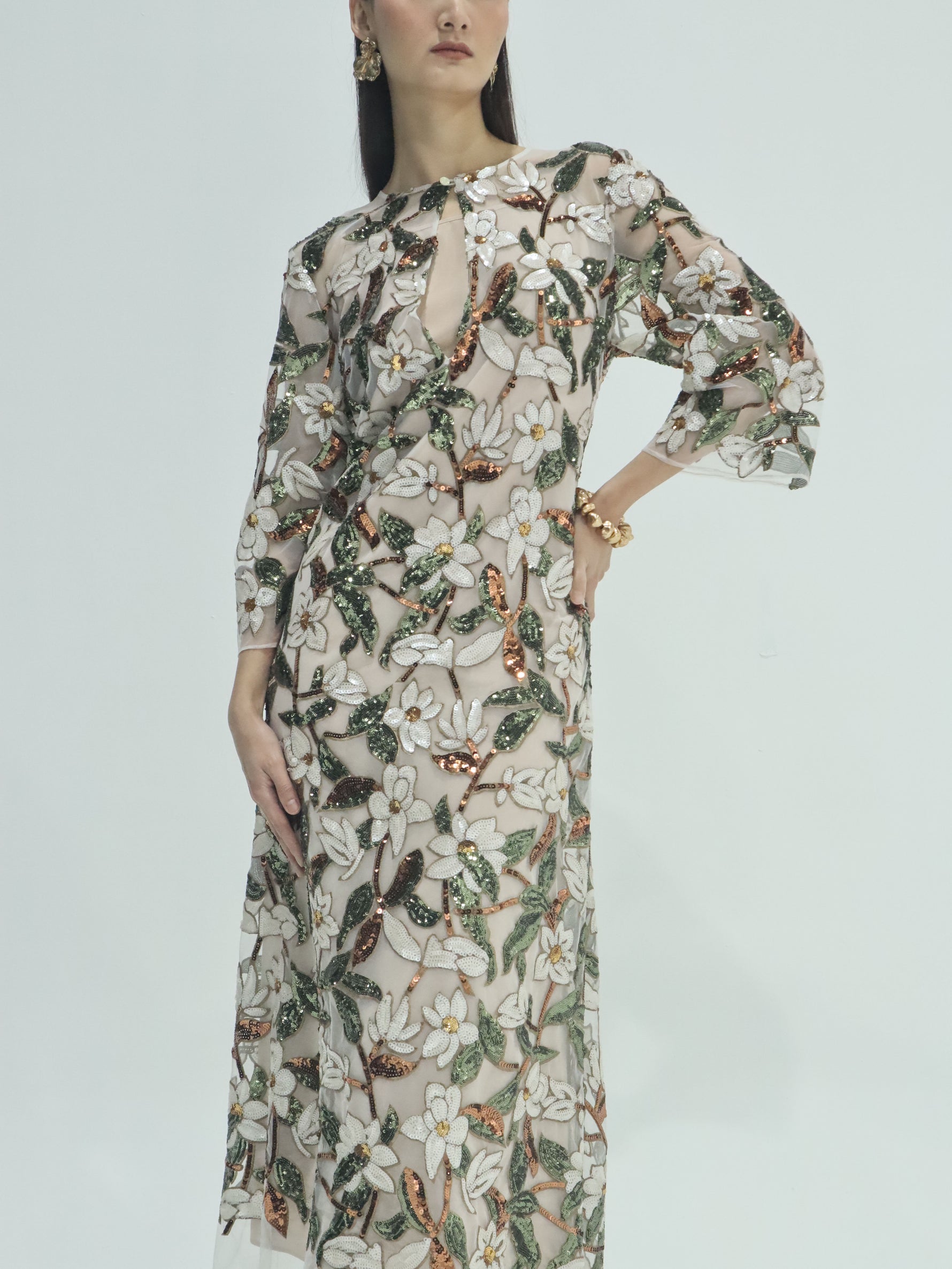 Its elongated, relaxed silhouette drapes beautifully, while the keyhole neckline, airy bell sleeves, and fluid hemline create an ethereal finish. Whether worn as a kaftan or gown, Esme transitions seamlessly from formal soirées to intimate celebrations.