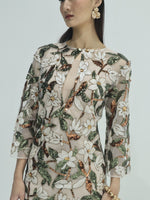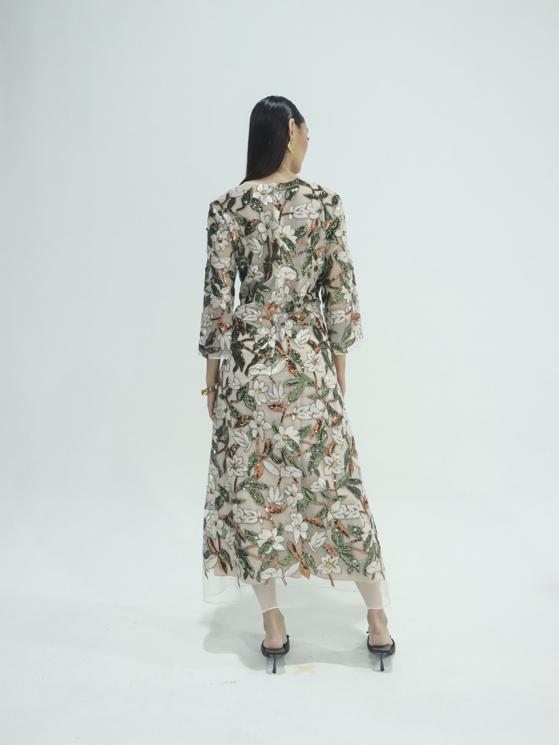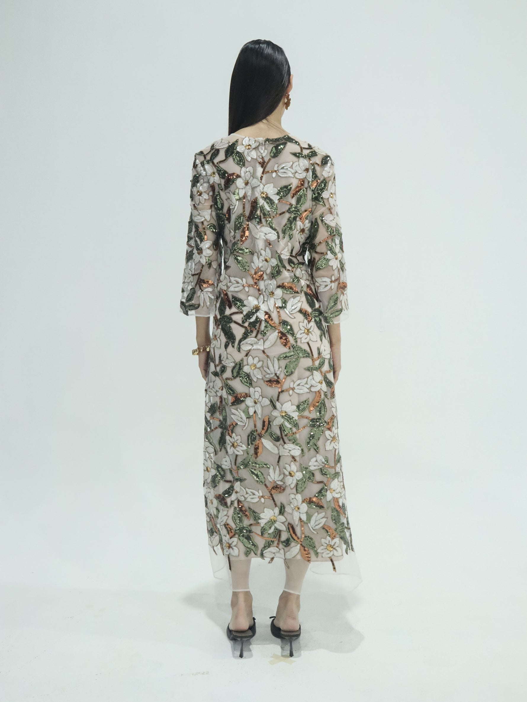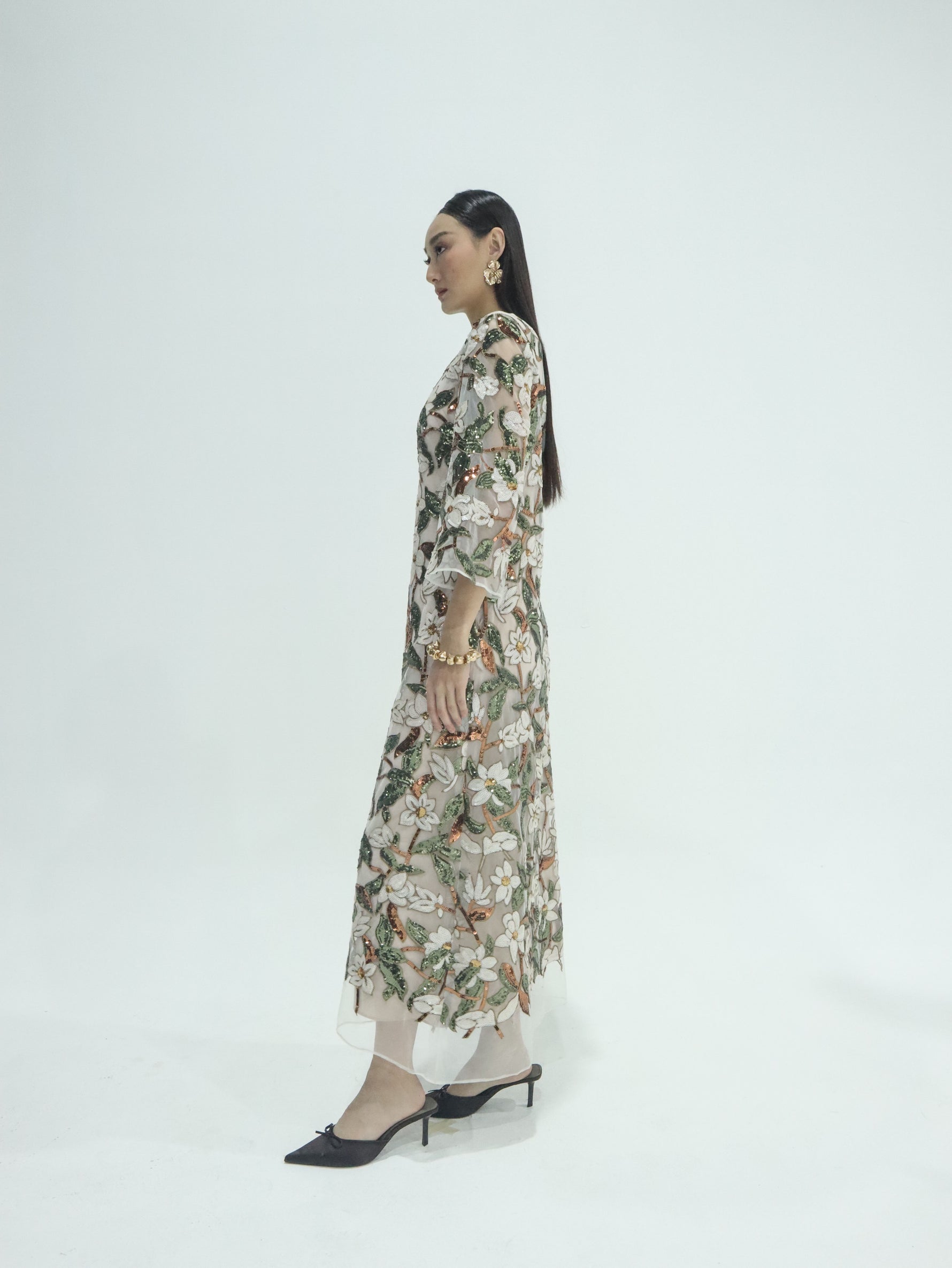Unit price perThe Esme Sequin Tulle Gown / Kaftan blends effortless elegance with modern romance. Crafted from delicate nude tulle, it features botanical embroidery and hand-placed sequins that shimmer with every movement.