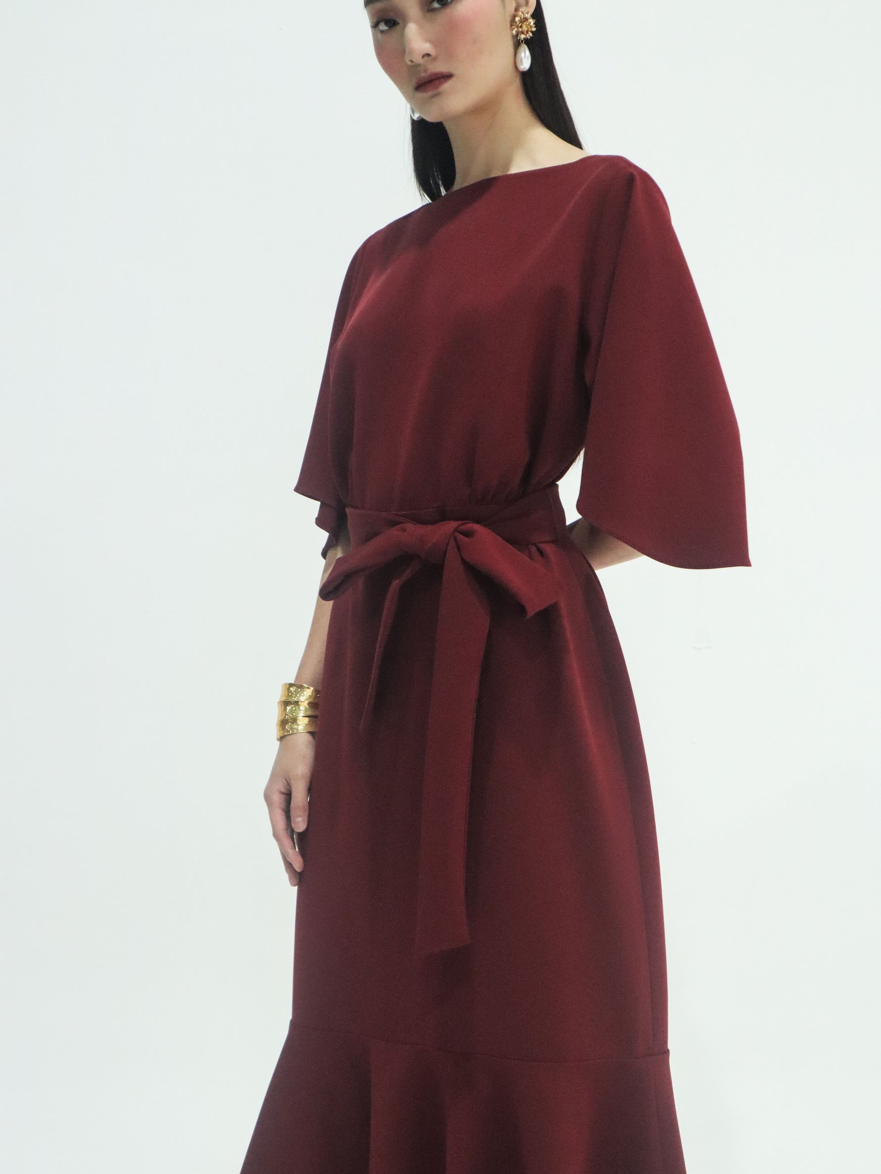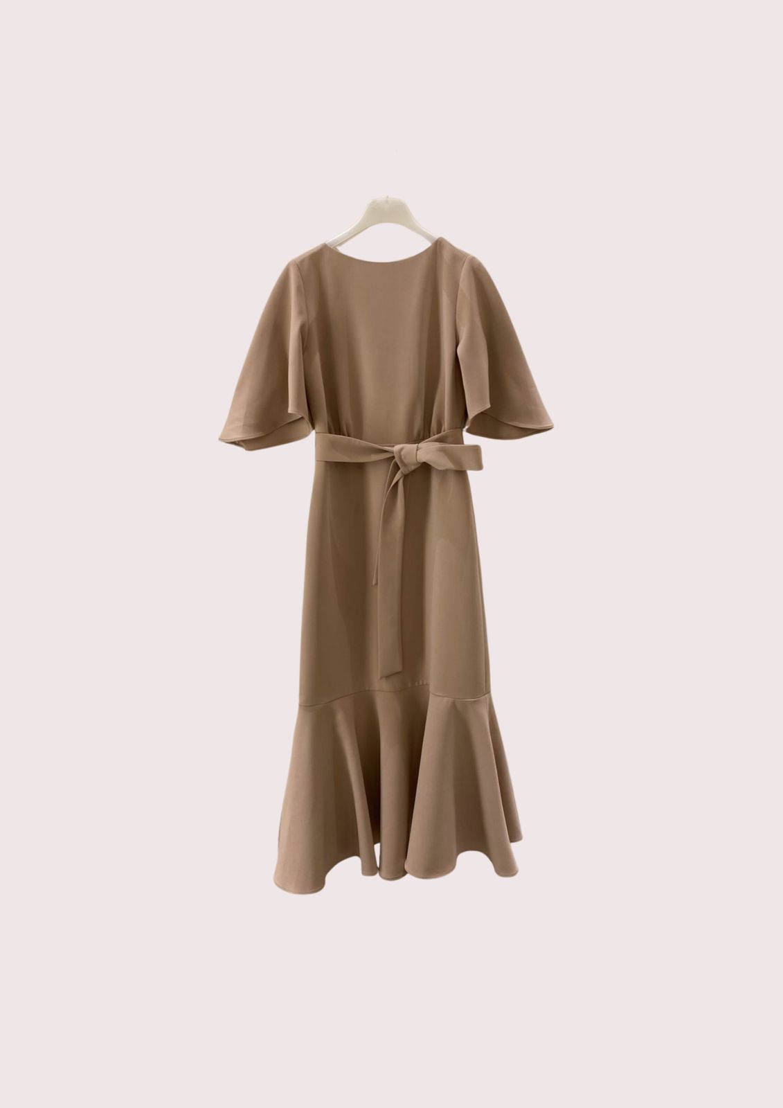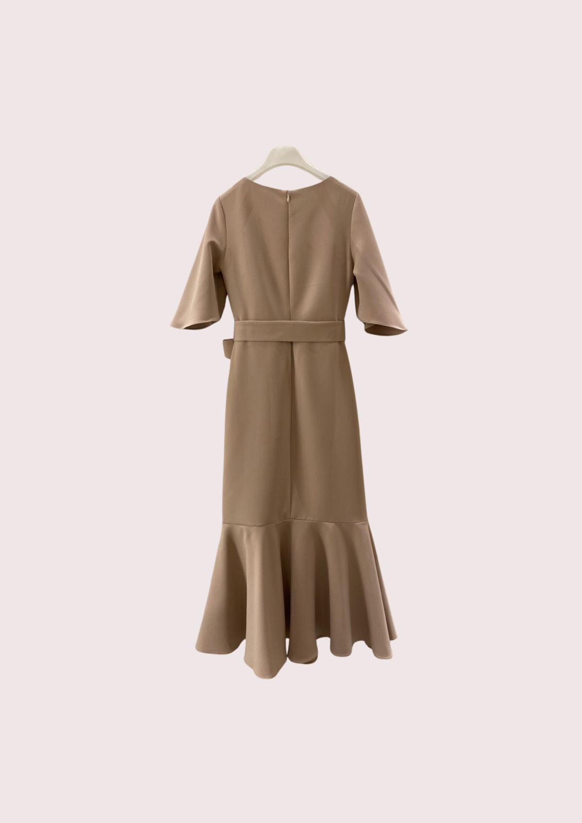 Unit price perThe Gabriella Suiting Dress is a refined piece designed for elegant evening occasions. It features a clean round neckline, soft flutter sleeves that fall just below the elbows, and a removable waist sash for subtle shaping. The skirt finishes with a flounced hem, adding gentle movement and a polished touch to its sleek silhouette.