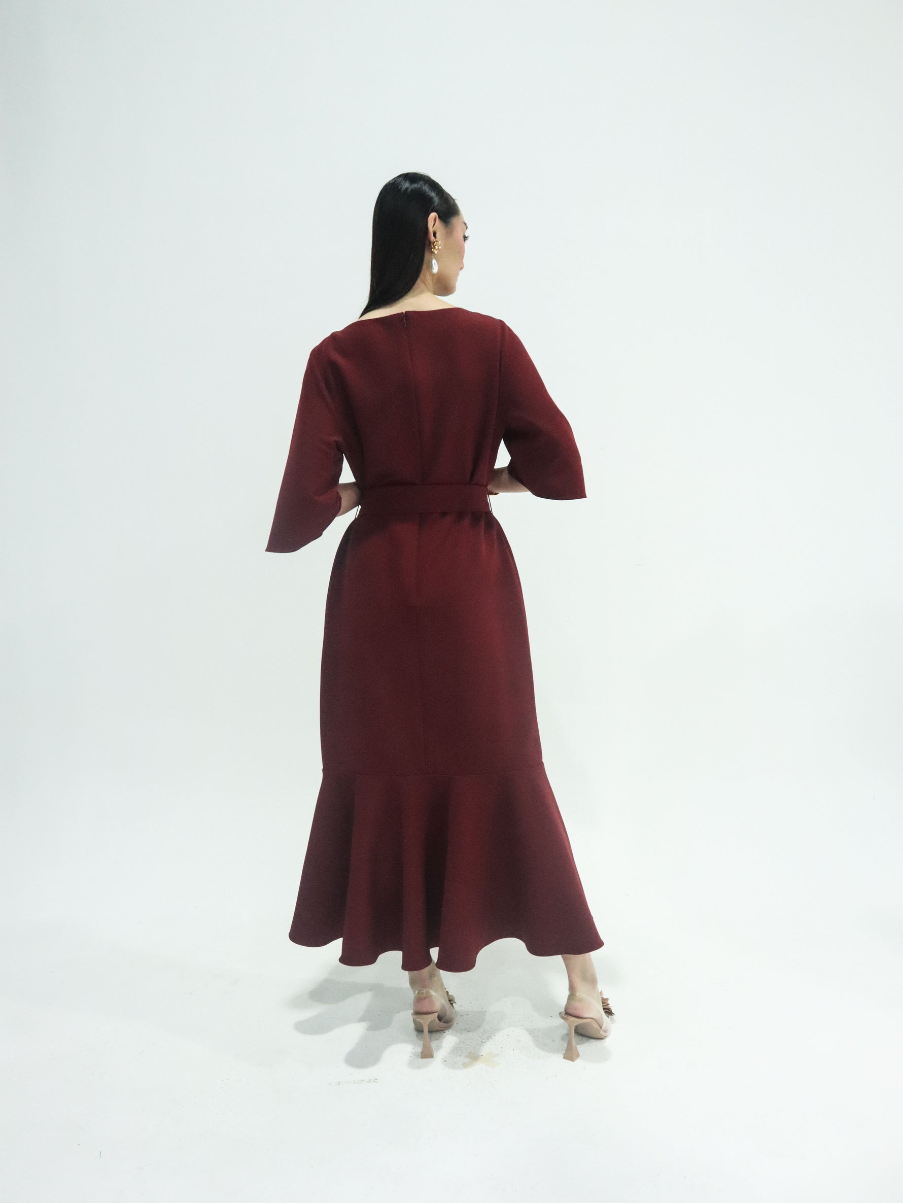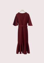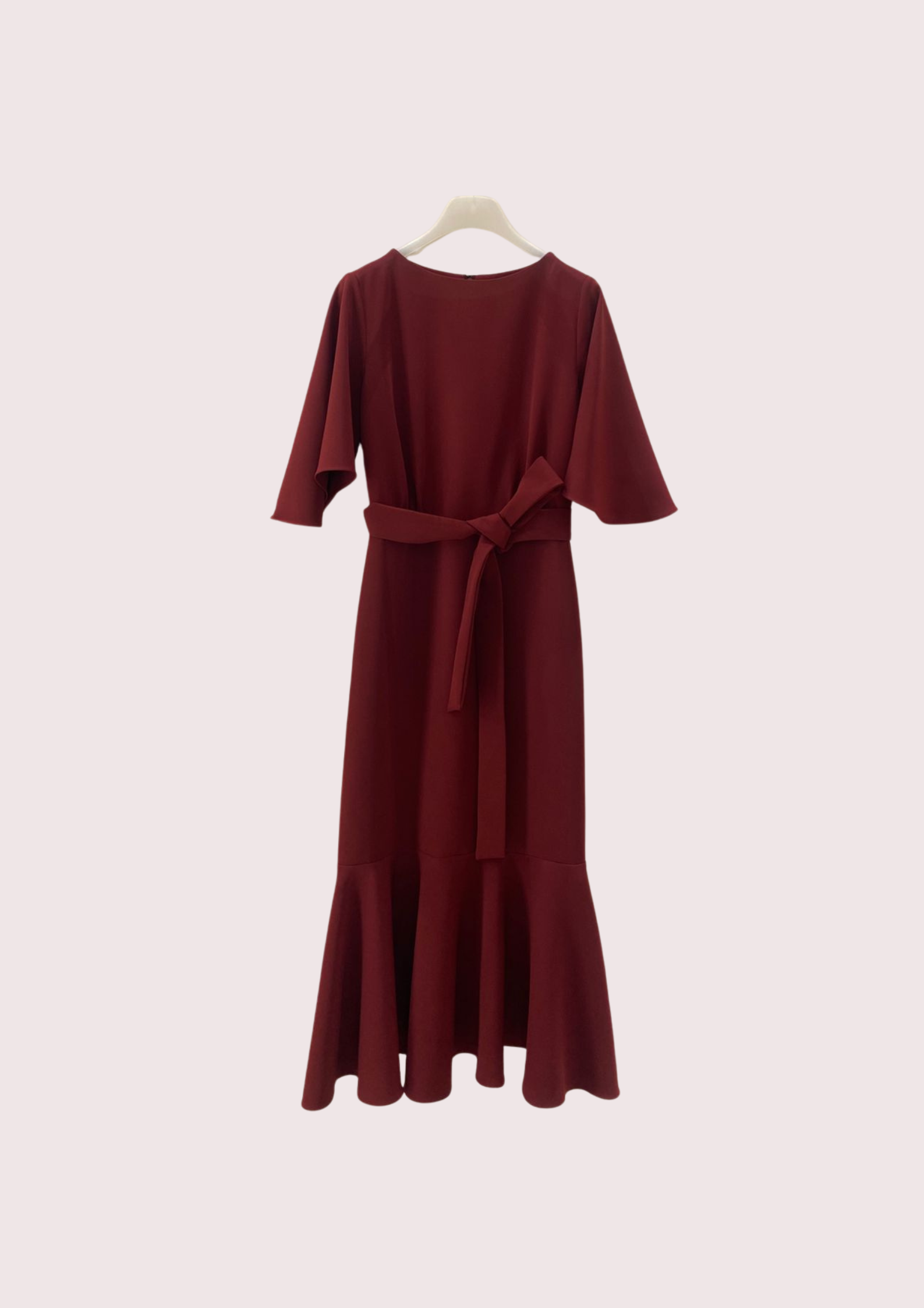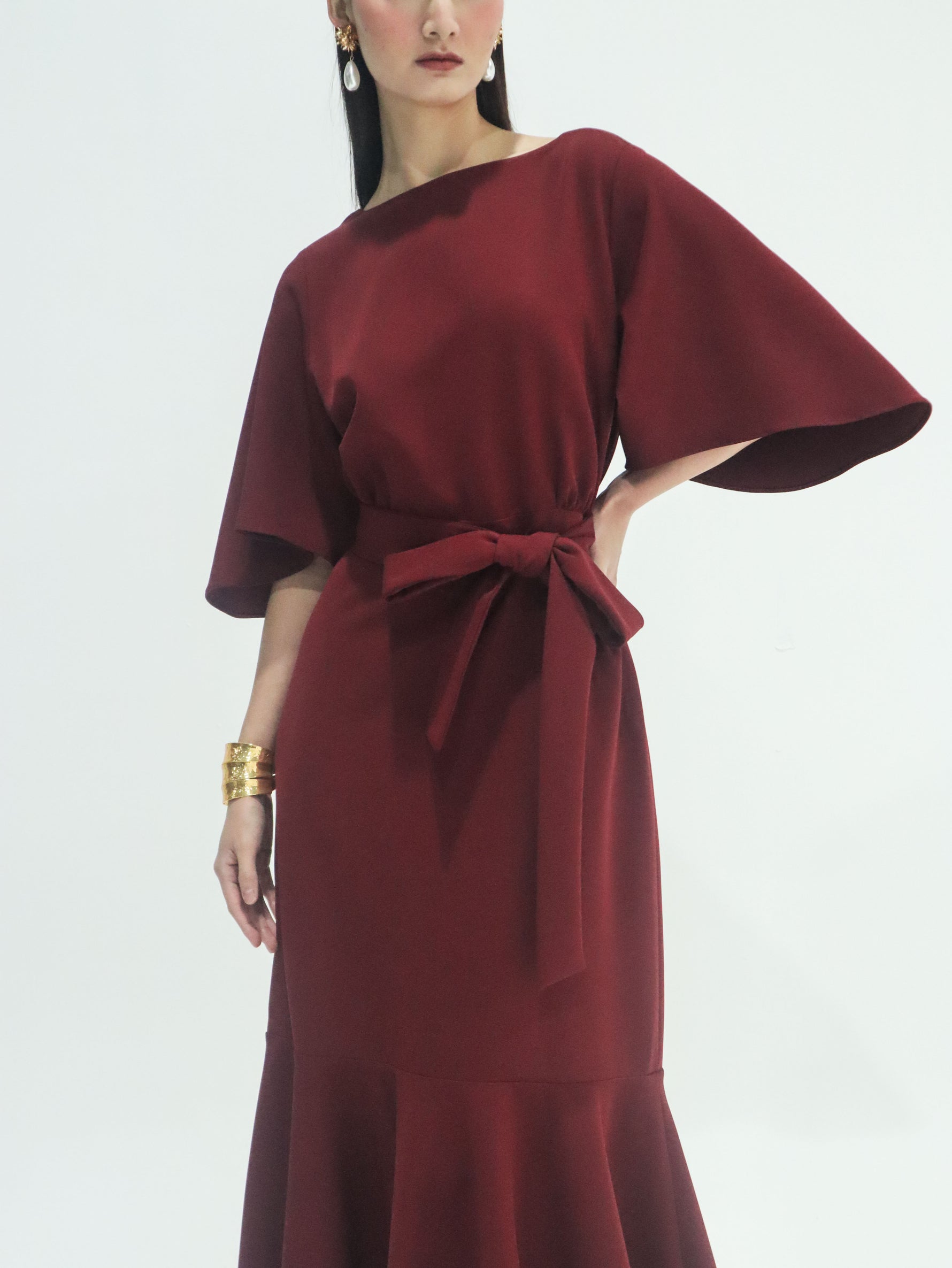 Unit price perThe Gabriella Suiting Dress is a refined piece designed for elegant evening occasions. It features a clean round neckline, soft flutter sleeves that fall just below the elbows, and a removable waist sash for subtle shaping. The skirt finishes with a flounced hem, adding gentle movement and a polished touch to its sleek silhouette.