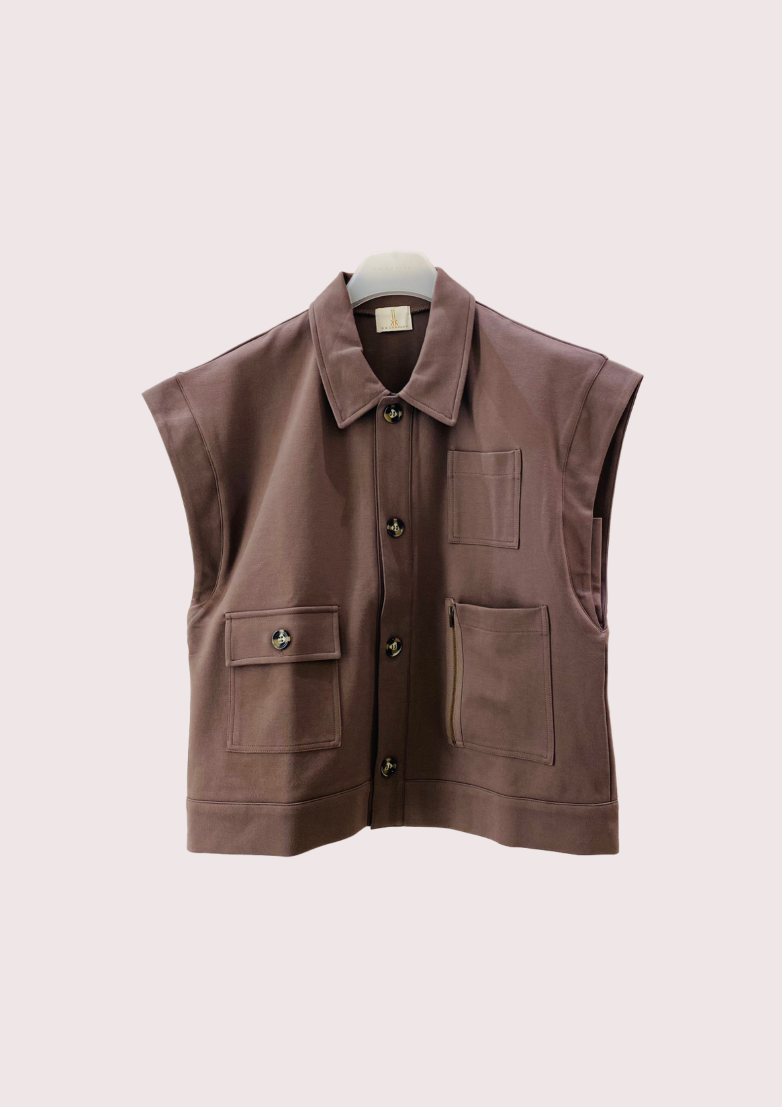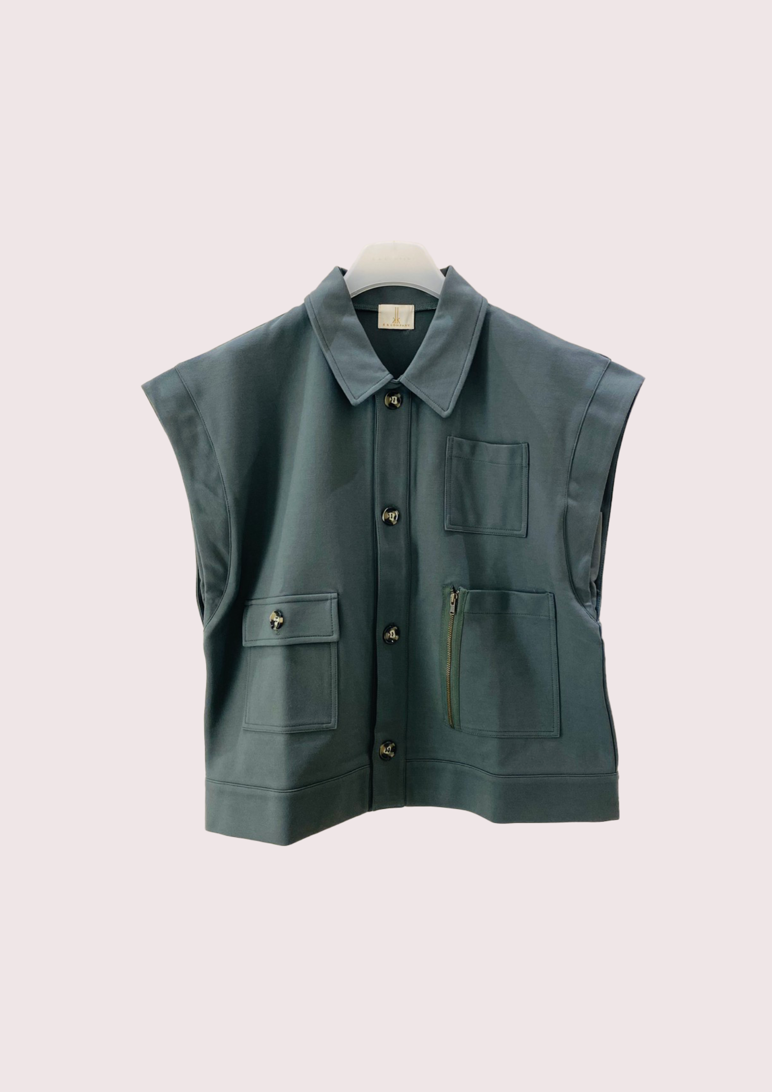 comes with three front pockets. One with button closure, zipper accent and one small chest pocket.